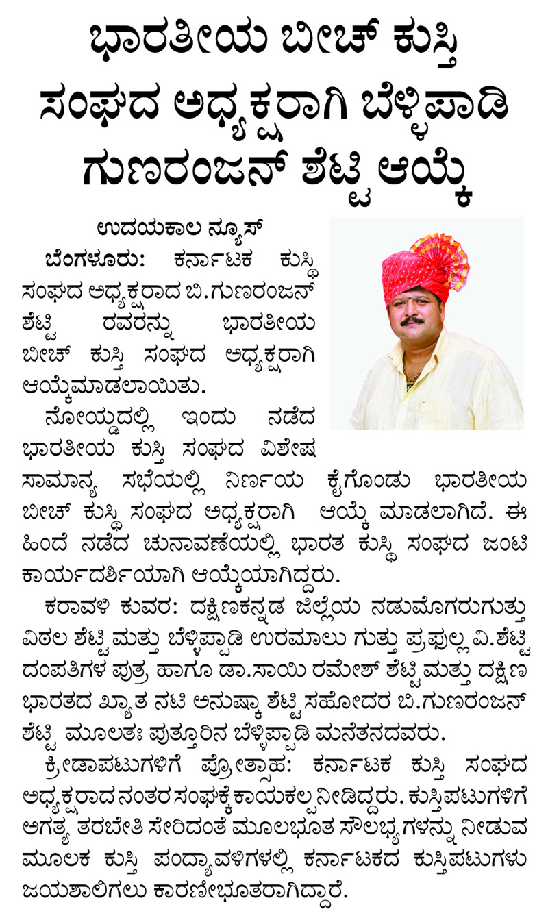ಭಾರತೀಯ ಬೀಚ್ ಕುಸ್ತಿ ಸಂಘದ ಅಧ್ಯಕ್ಷರಾಗಿ ಬೆಳ್ಳಿಪ್ಪಾಡಿ ಗುಣರಂಜನ್ ಶೆಟ್ಟಿ ಆಯ್ಕೆ
