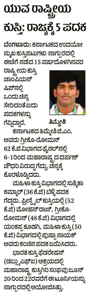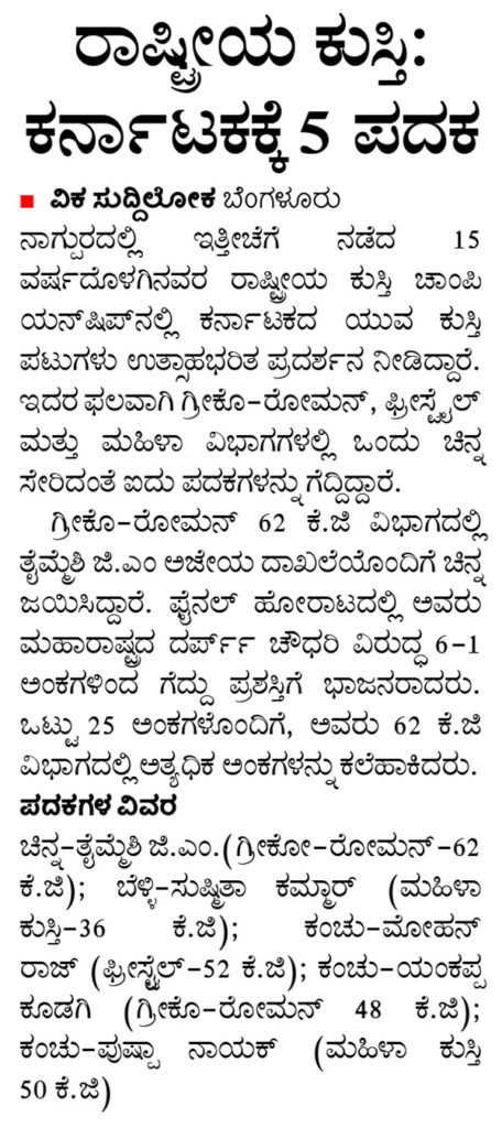 ಯುವ ರಾಷ್ಟ್ರೀಯ ಕುಸ್ತಿ: ಕರ್ನಾಟಕಕ್ಕೆ 1 ಚಿನ್ನದ ಪದಕ ಸೇರಿ 5 ಪದಕ