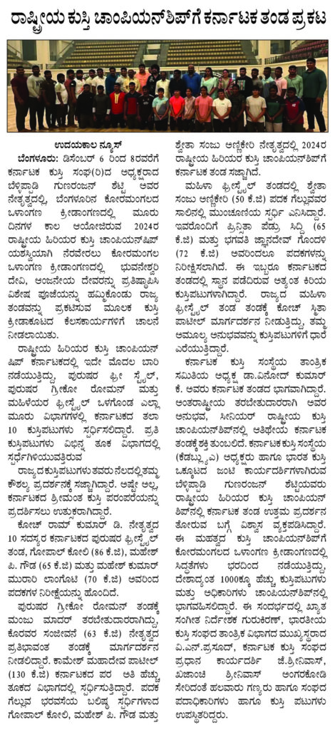 ರಾಷ್ಟ್ರೀಯ ಕುಸ್ತಿ ಚಾಂಪಿಯನ್ ಶಿಪ್ ಗೆ ಕರ್ನಾಟಕ ತಂಡ ಪ್ರಕಟ