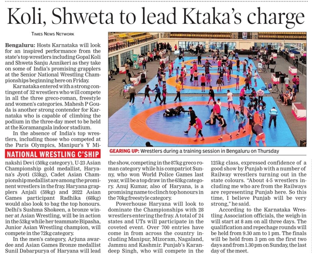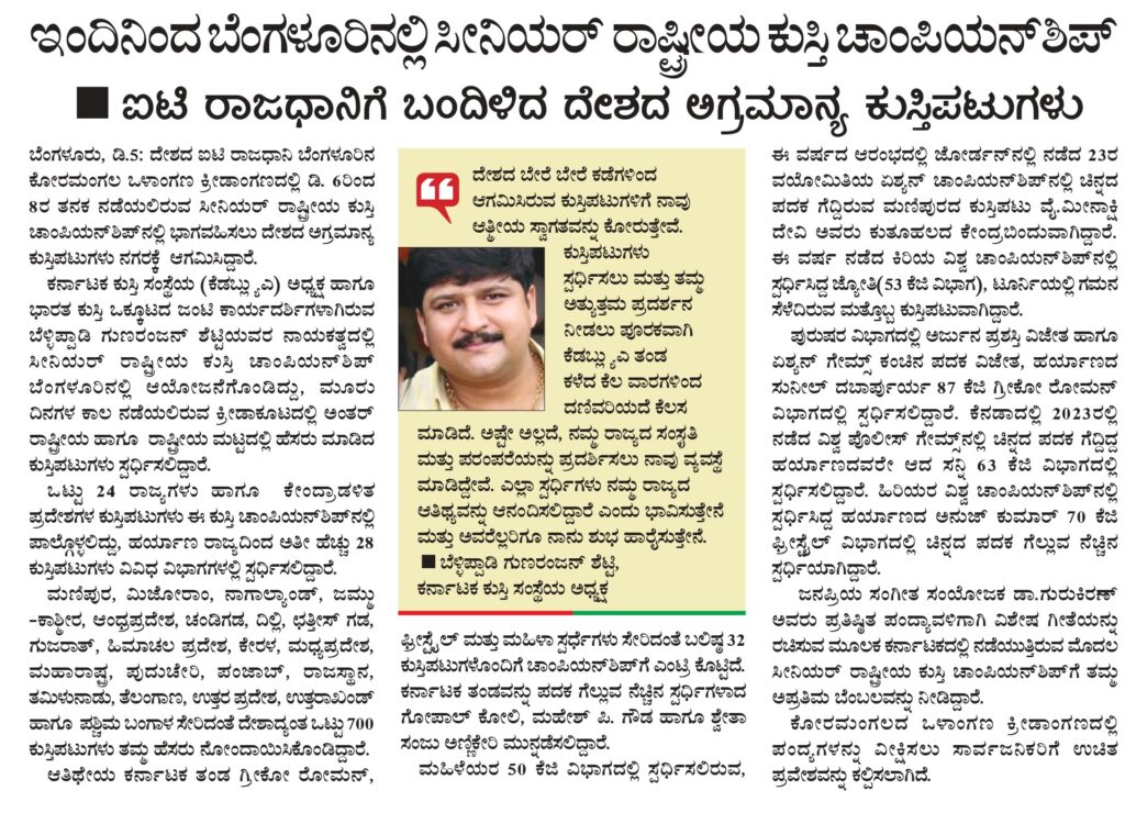 ಇಂದಿನಿಂದ ಬೆಂಗಳೂರಿನಲ್ಲಿ ಸೀನಿಯರ್ ರಾಷ್ಟ್ರೀಯ ಕುಸ್ತಿ ಚಾಂಪಿಯನ್ಶಿಪ್