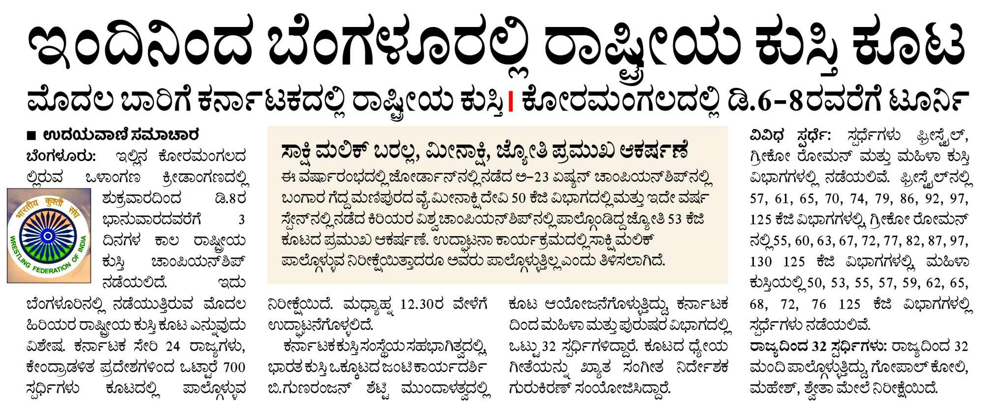 ಇಂದಿನಿಂದ ಬೆಂಗಳೂರಲ್ಲಿ ರಾಷ್ಟ್ರೀಯ ಕುಸ್ತಿ ಕೂಟ