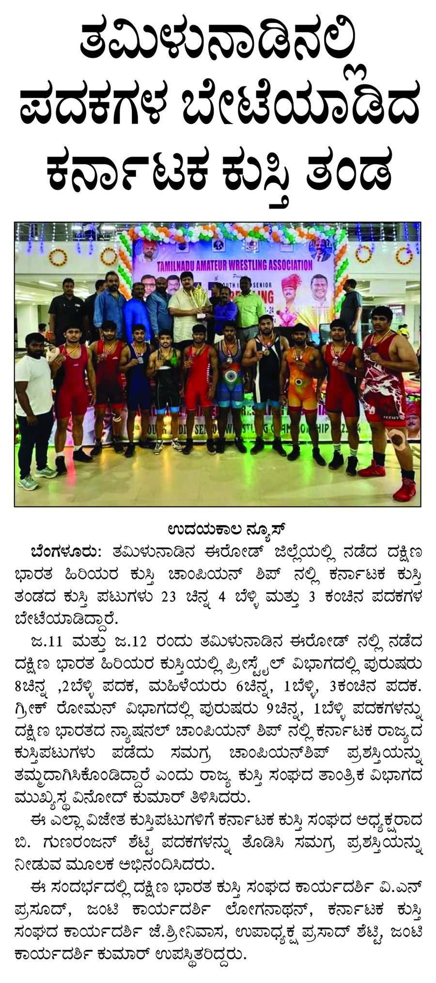 ತಮಿಳುನಾಡಿನಲ್ಲಿ ಪದಕಗಳ ಬೇಟೆಯಾಡಿದ ಕರ್ನಾಟಕ ಕುಸ್ತಿ ತಂಡ